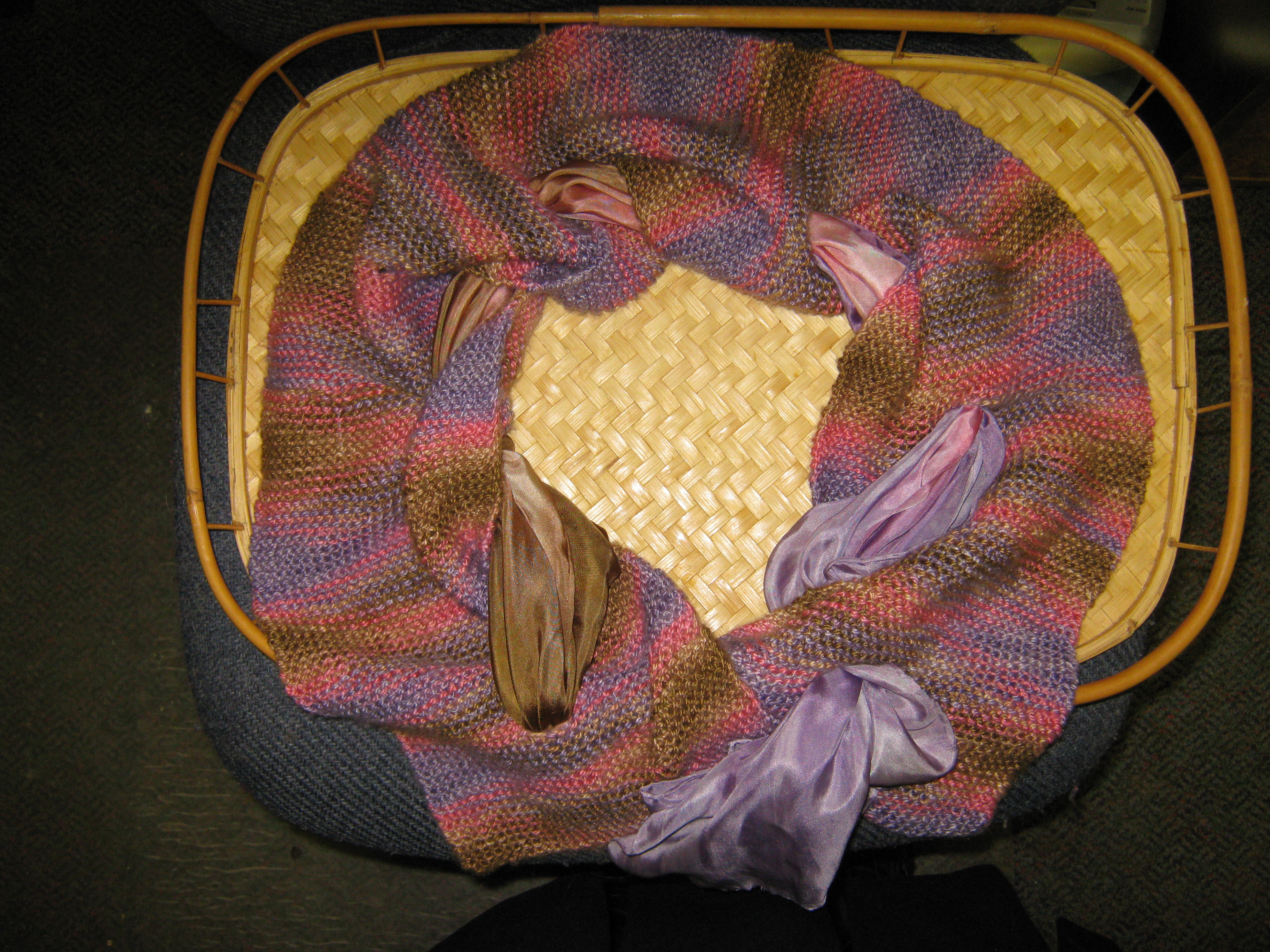 a Scarf is ready for her close-up, Mr. DeMille.  This pic shows just one of the several ways this scarf can be worn, today, this one’s my favorite.  I have a feeling that this scarf is going to be getting a lot wear time.  I’ll try to remember to get pics posted of all the different ways this scarf can be worn, if I can figure them out.  Maybe I need to drop in at Yarn Mart for some suggestions – ooh, is that a new colorway over there and, look, there’s something sparkly over there.  Yeah, I think a trip to YM is in order.  These pics are not so great, my usual spot was out of commission and I had to wing it in my office.