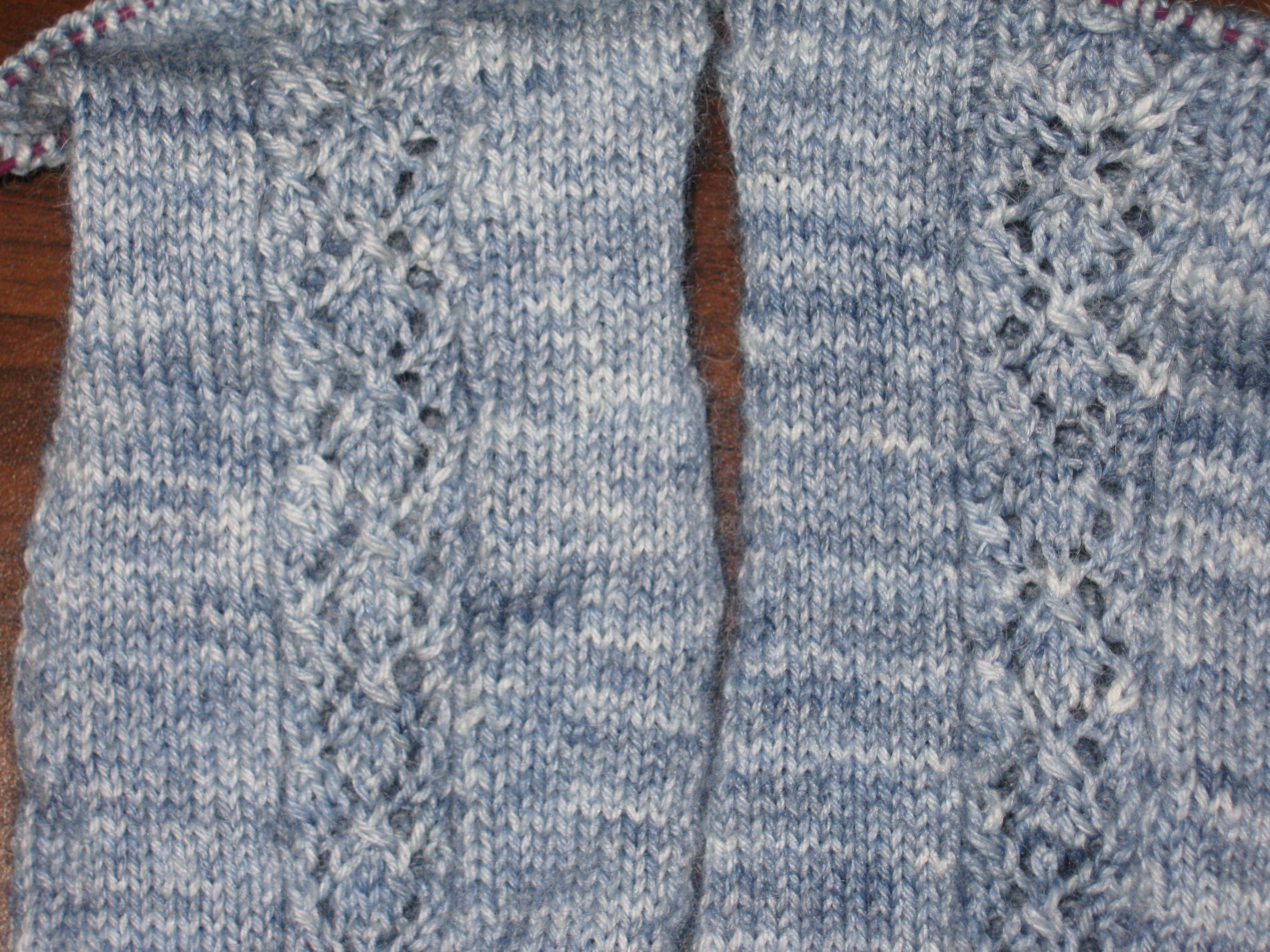 I picked up a pair of socks that I tossed aside about six months ago when my head was turned by a cuter pattern and prettier yarn, but unearthed the sock project accidently. The pattern is Quickset Socks by Megan Marshall and who knows about the yarn. That wasn’t unearthed during my initial wip excavation. If I find it, I’ll post it. Here’s the stitch detail –