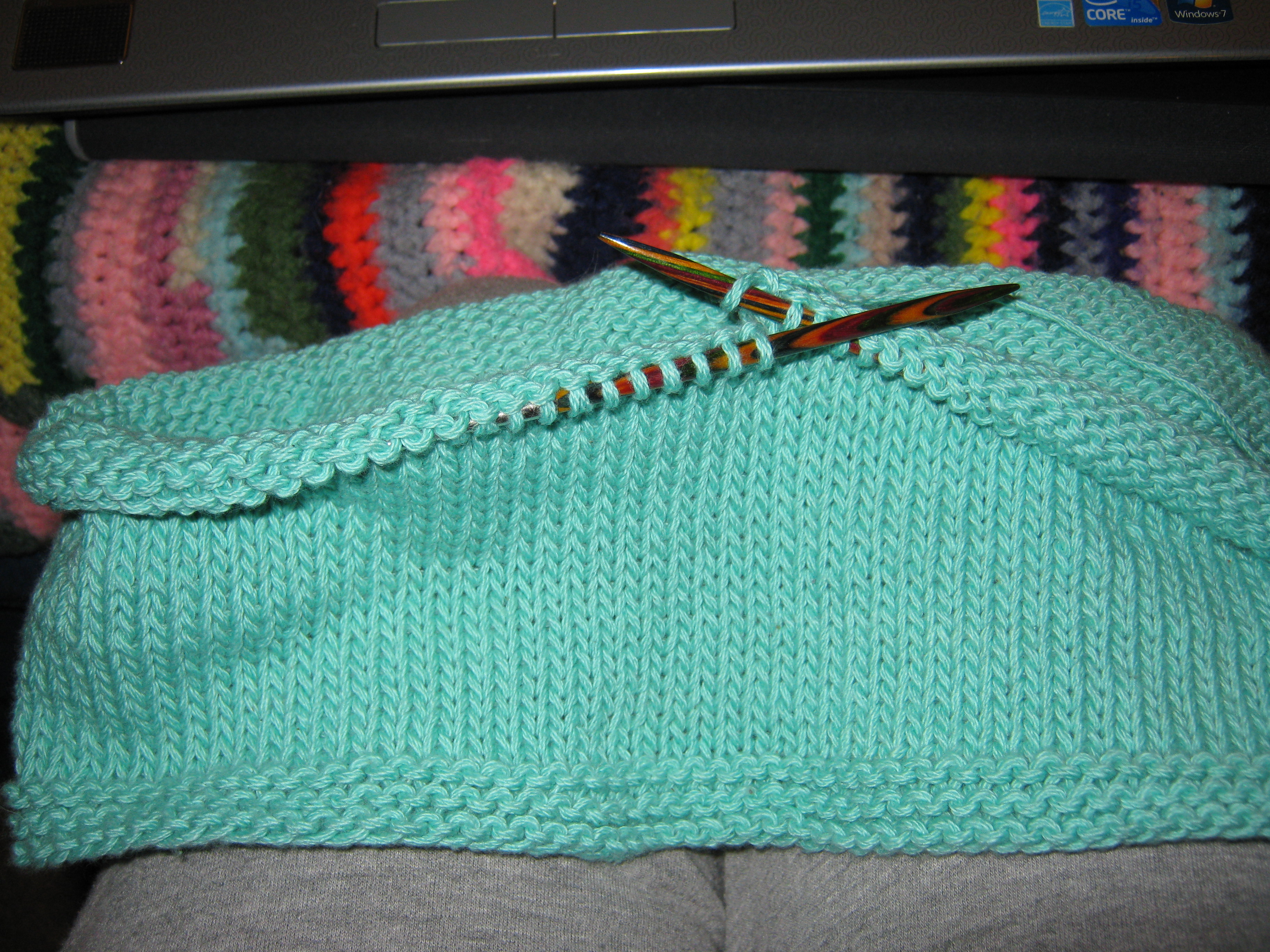 excited when she finds out that her Fayetteville LYS still has some Cottontail yarn in stock and will hold it. Same color number, same lot number, same everything. Now I can sit back and enjoy the Minnowknits Pinafore Dress that is slowly growing on the needles. I hate to worry about whether I’ve purchased enough yarn to finish a project. Actually, for this reason, I usually buy at least one extra skein, just to make sure. Of course, this makes my stash grow by leaps and bounds, since usually the pattern calculations are pretty accurate, but, as we all know, a stash can never be too big! See how it’s growing?