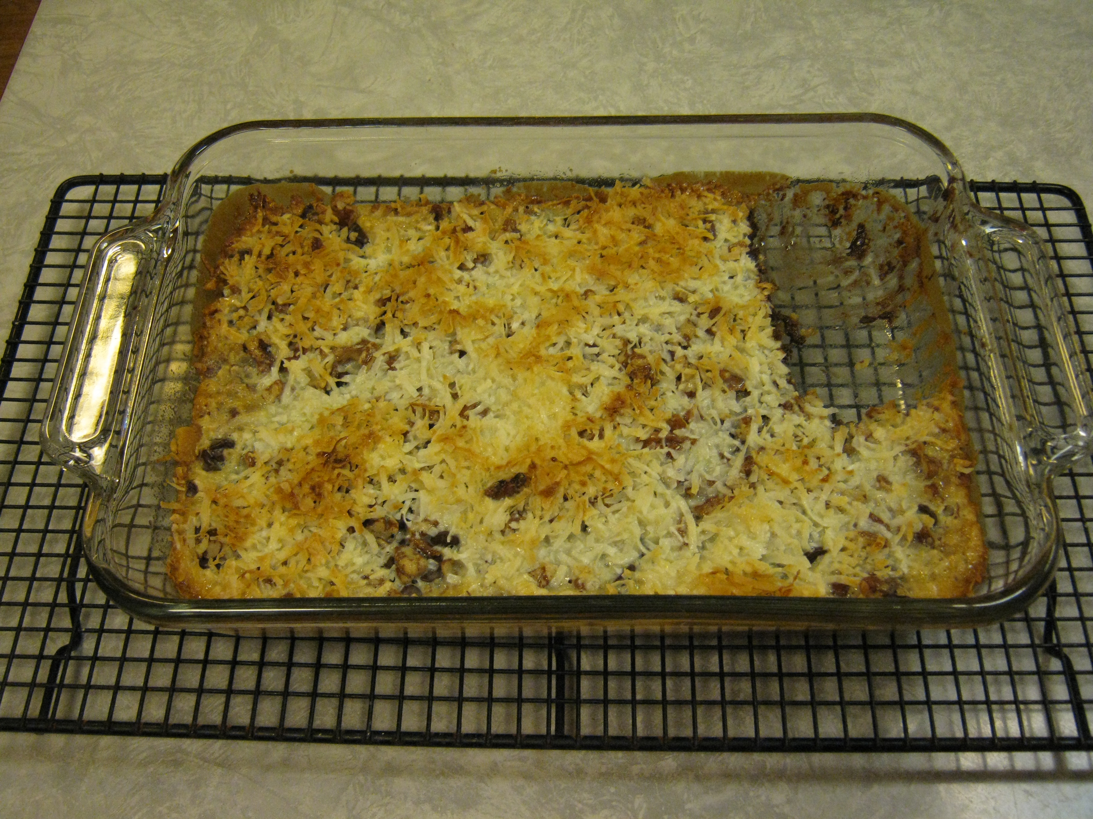 I baked a pan of Hello Dollies on a whim this afternoon. I had high hopes that I might get a pic before Mr. Iknead helped himself. Fail. It happened while I was fetching the camera. Sigh. Here’s the not so perfect product