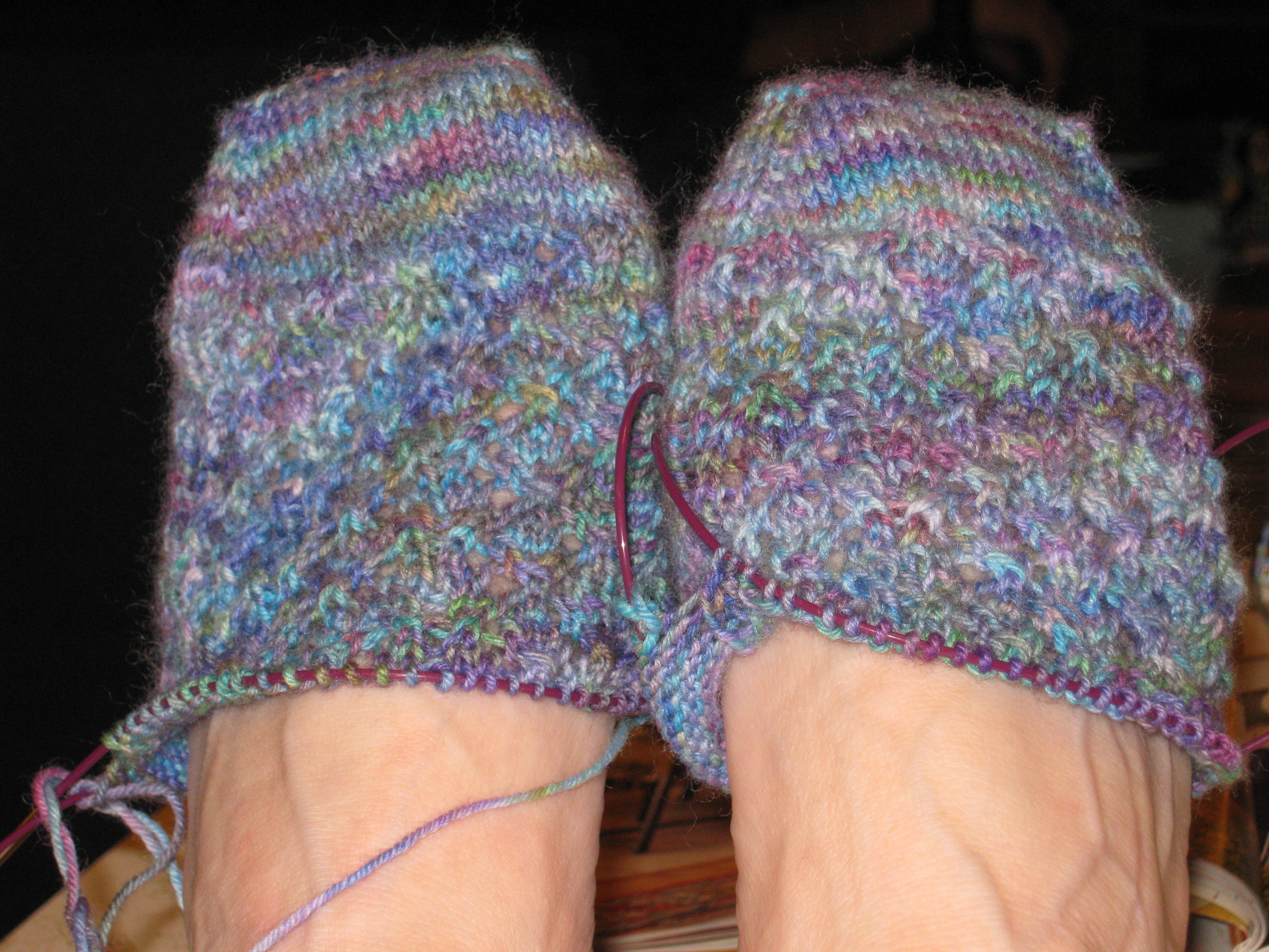 On a happier note, the Catnip Socks are really coming along nicely.  When I slipped them on earlier today, the stitch pattern really stood out.  I’m really happy with them and the Araucania yarn.  This picture is horrid and I apologize ahead of time for my gnarly feet –