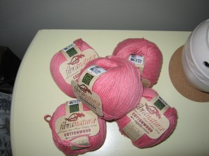 It’s Fibranatura Cottonwood, 100% organic cotton, the color is called Cindy, #41109. It’s more of a coral color than it’s pictured.