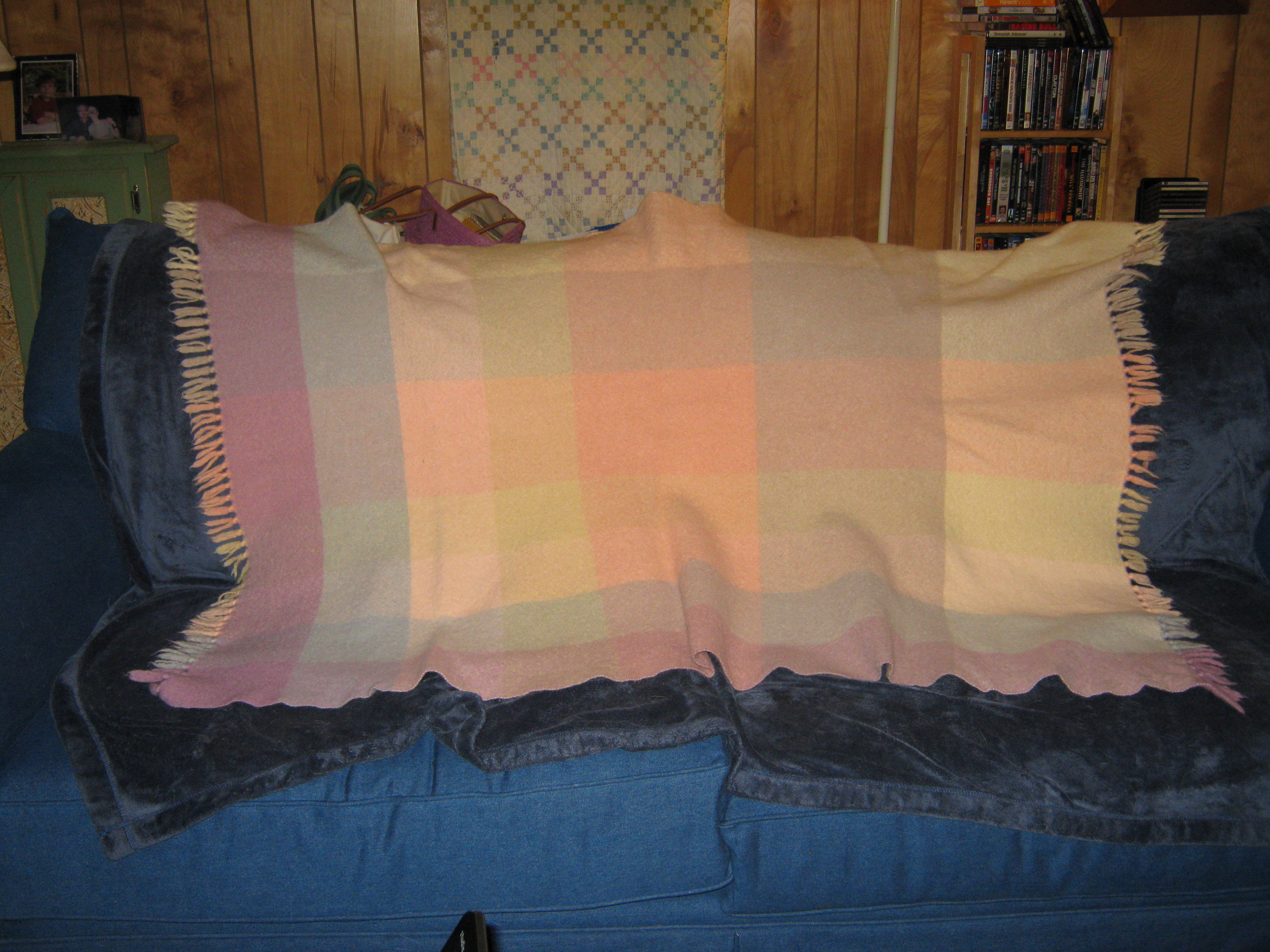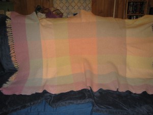 While cleaning out a closet of theirs yesterday, I found this gorgeous throw. I think it belonged to one of my mom’s sisters (she had five), it’s vaguely familiar, but I hadn’t seen it in I don’t know how long. I’m in love with it. It has a tag reading The Three Weavers, Houston, Texas, Handwoven, 100% virgin wool. I’m not sure if these pics do it justice but you get the idea.