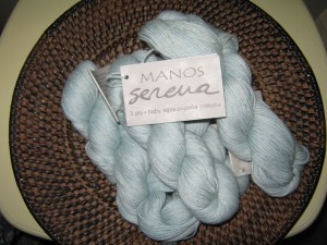 Manos del Uruguay, 60% baby alpaca and 40% pima cotton, color 2318, four skeins.  I’ve got big plans for the Manos, a shop sample was a Rav pattern, I think called Drop Stitch Shawl #2.