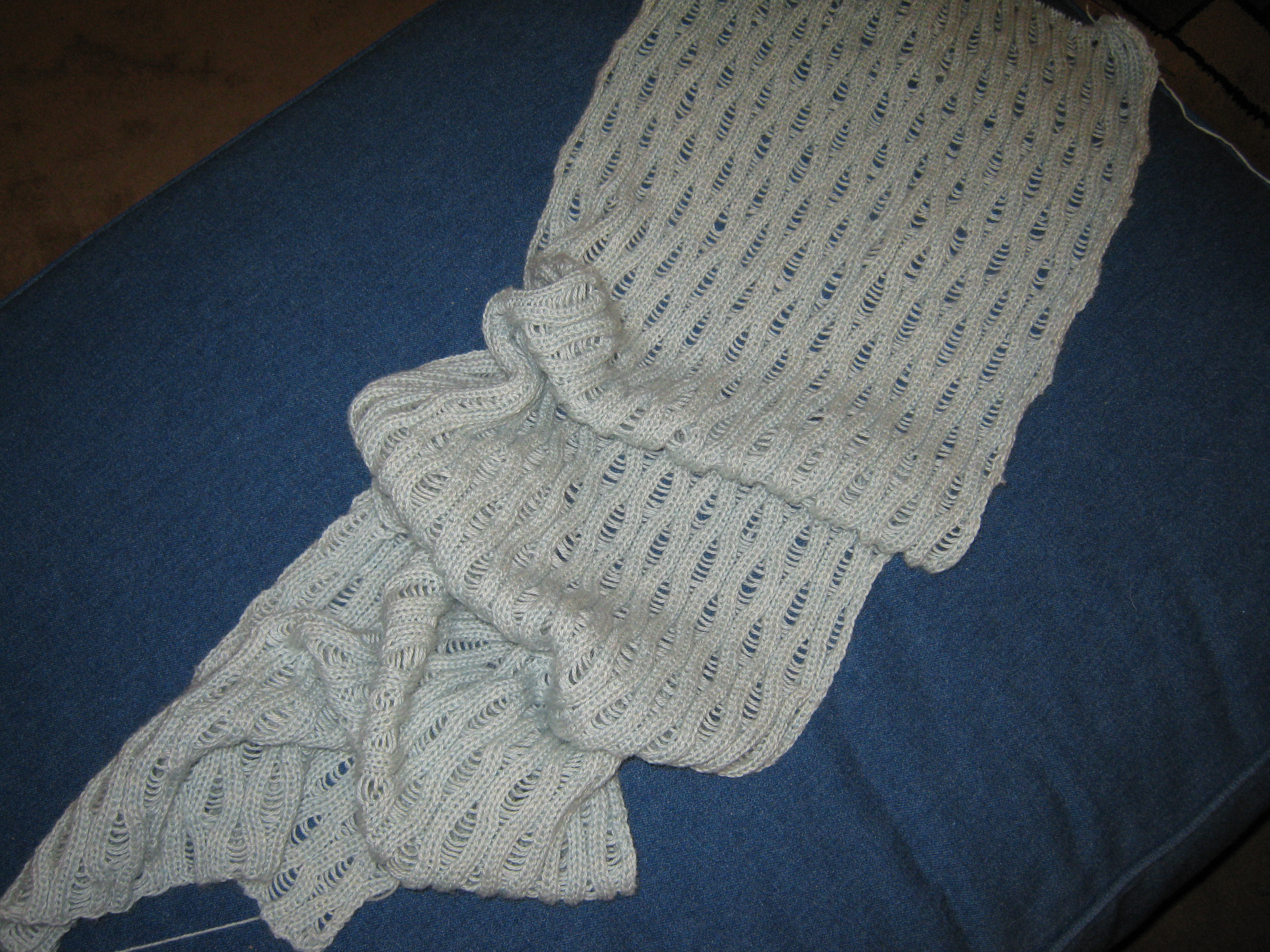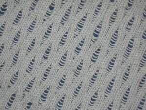 Knitting. I’ve done a ton in the past couple of weeks, partly because of the car time I’ve had (Mr. Iknead prefers to drive, I prefer to ride. One more example of our fitting together, I suppose). Now I’m getting anxious about running out of Manos for the Drop Stitch Shawl. This happens every time I get close to the end of a project, you’d think I’d catch on that, but still I think I’ll give Yarnmart a call in the morning, just in case.