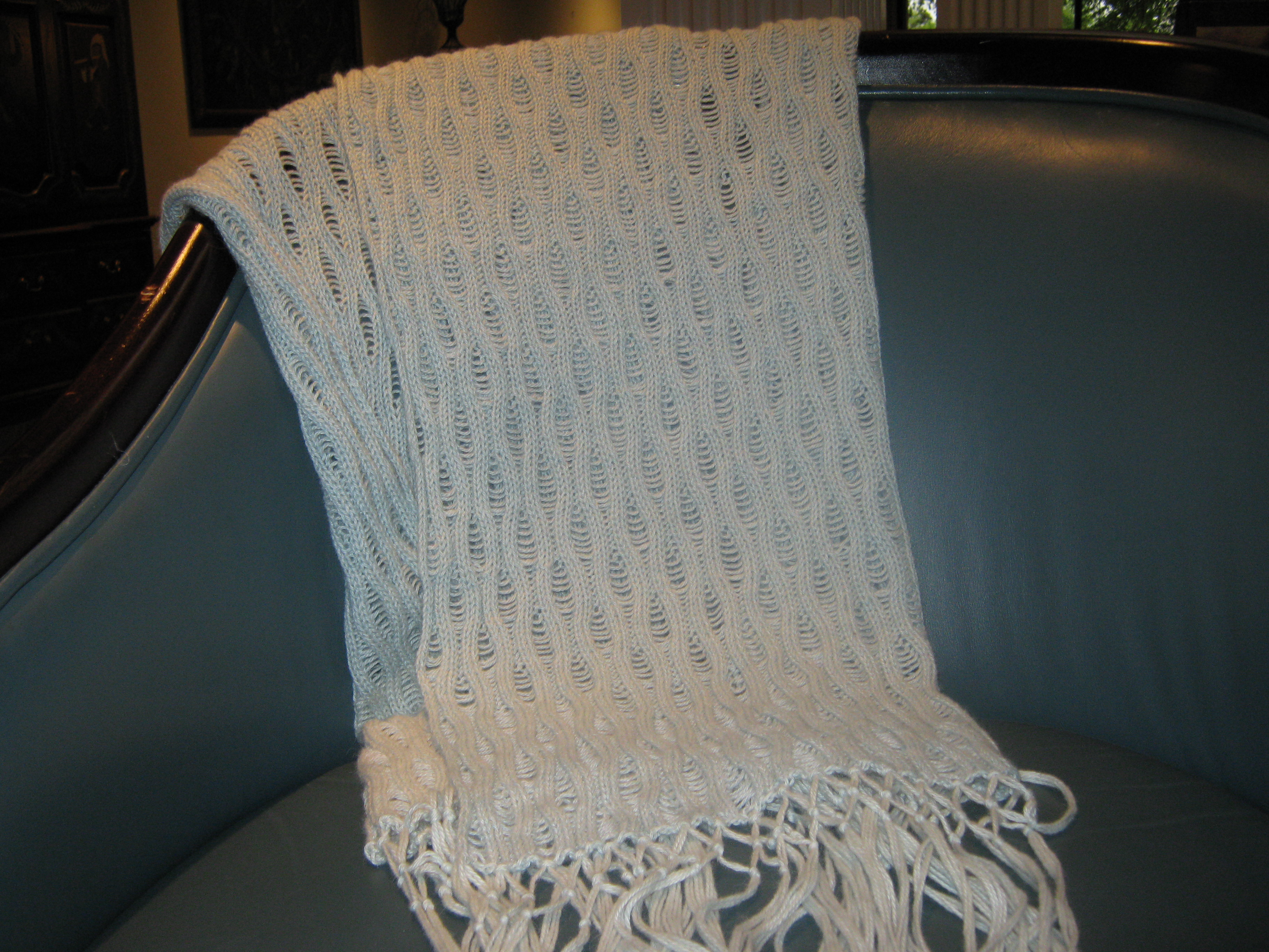 finally is completely finished, fringed, washed, blocked, photographed, it’s done. Here’s how it turned out. The light aqua didn’t photo well, but you get the idea.