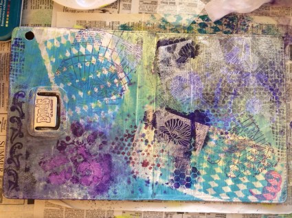 When I inherited Mr. IKnead’s iPad, I also inherited the case. Absolutely nothing wrong with it – except for the color. Don’t misunderstand me – I love brown, look at Liesl up there. Brown is good, the color of coffee and chocolate, after all, but the brown cover just wasn’t doing it for me. So, I changed it. There’s a little of everything, inks, stamps, stencils and acrylic paint. I love the way it turned out. Take a look for yourself.