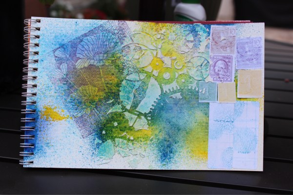 My newest mixed media project, with modeling paste, ink stamps, postage stamps and acrylic paint.