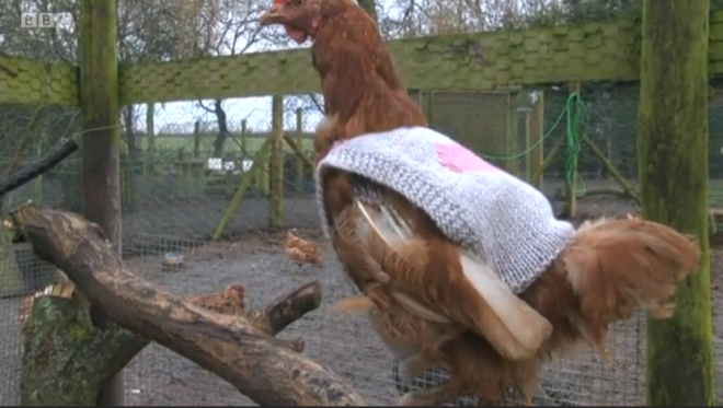 Our local BBC news had a story on the chickens at Raystede animal centre today and I’ve spotted one of the chickens wearing one of my jumpers! Yay! Here she is, the gorgeous girl. Mine is the one with the heart on it. Excuse not too great quality of the pictures, they are just print screens of the news story.