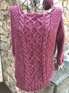 All this baby is lacking is the cowl neck and the second sleeve.  I’m debating whether or not to carry it to Bangkok, 25-30 hours of flight (knitting) time would just about do it.  It’s just a lot of sweater in what I’m afraid will be a small space.  Maybe Mr. iknead and I will get lucky and the third seat will be unoccupied, providing me with more elbow room and a place to put all my knitting essentials.  It’s happened before. 🤞🤞🤞