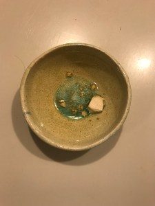 When the bottom blew out, I guess the small bowl wanted to get into the act and ended up with a few stray shards fused to its inside.
