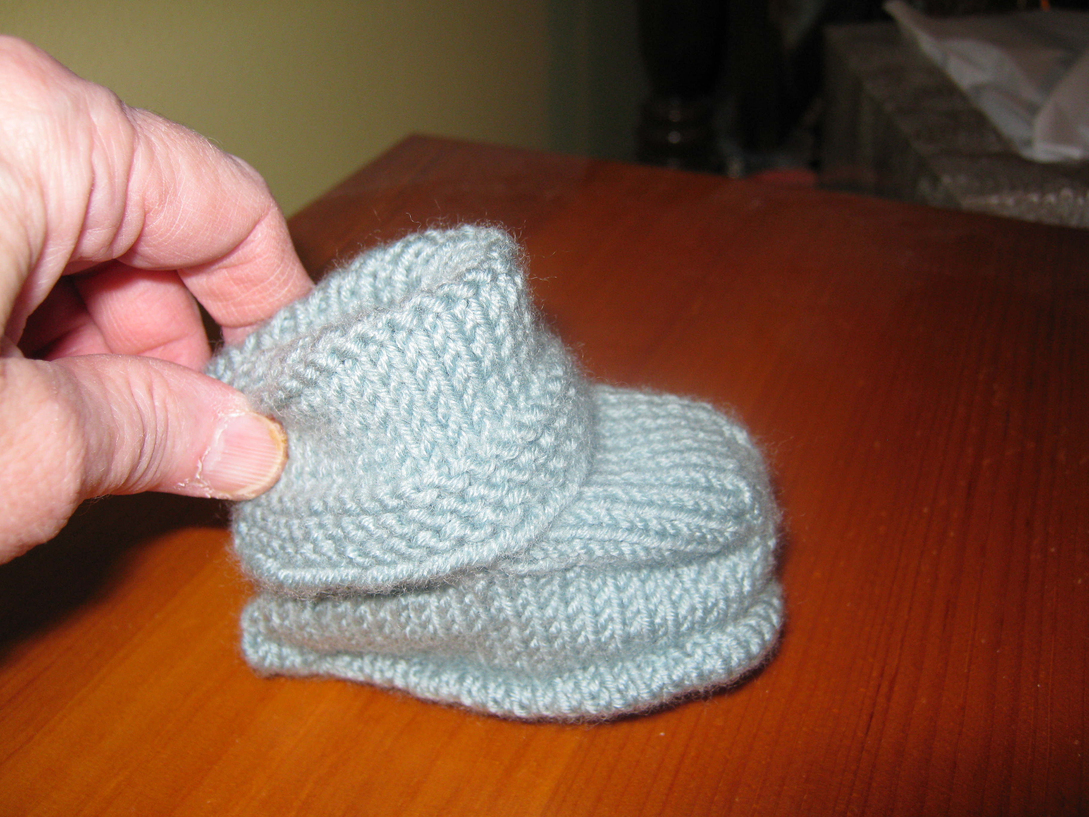 up. The Bunny booties? Yeah, well, last night I was tweaking the ears a little, I just wasn’t satisfied with the way I had sewn one on and in the process of trying to fix it, I cut a hole in the bootie. A hole as in big enough to stick a finger through. WTF?! Now what?, start from scratch again with the same pattern or give up and pick a different one? Really, at the moment my attitude is so bad that I don’t care if I never knit another bootie in this life. Gah!!
