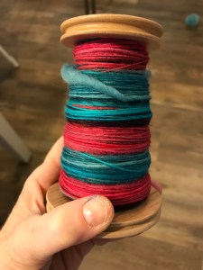 It’s been  much easier to spin than knit or crochet with my gimped up finger, so Violet the Spinning Wheel has been put to heavy use this week. This particular roving came from Three Waters Farm and is 100% Falkland Top.  The colorway is Red Hot and Blue.