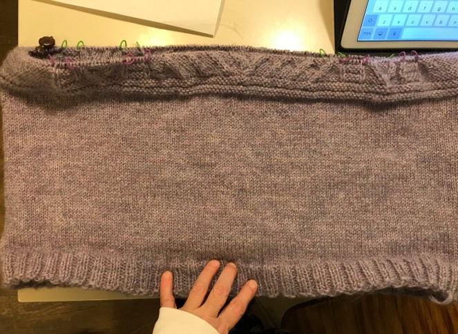 I’m back on track  with my Gray Day Gansey and am about an inch away from separating for the sleeves.
